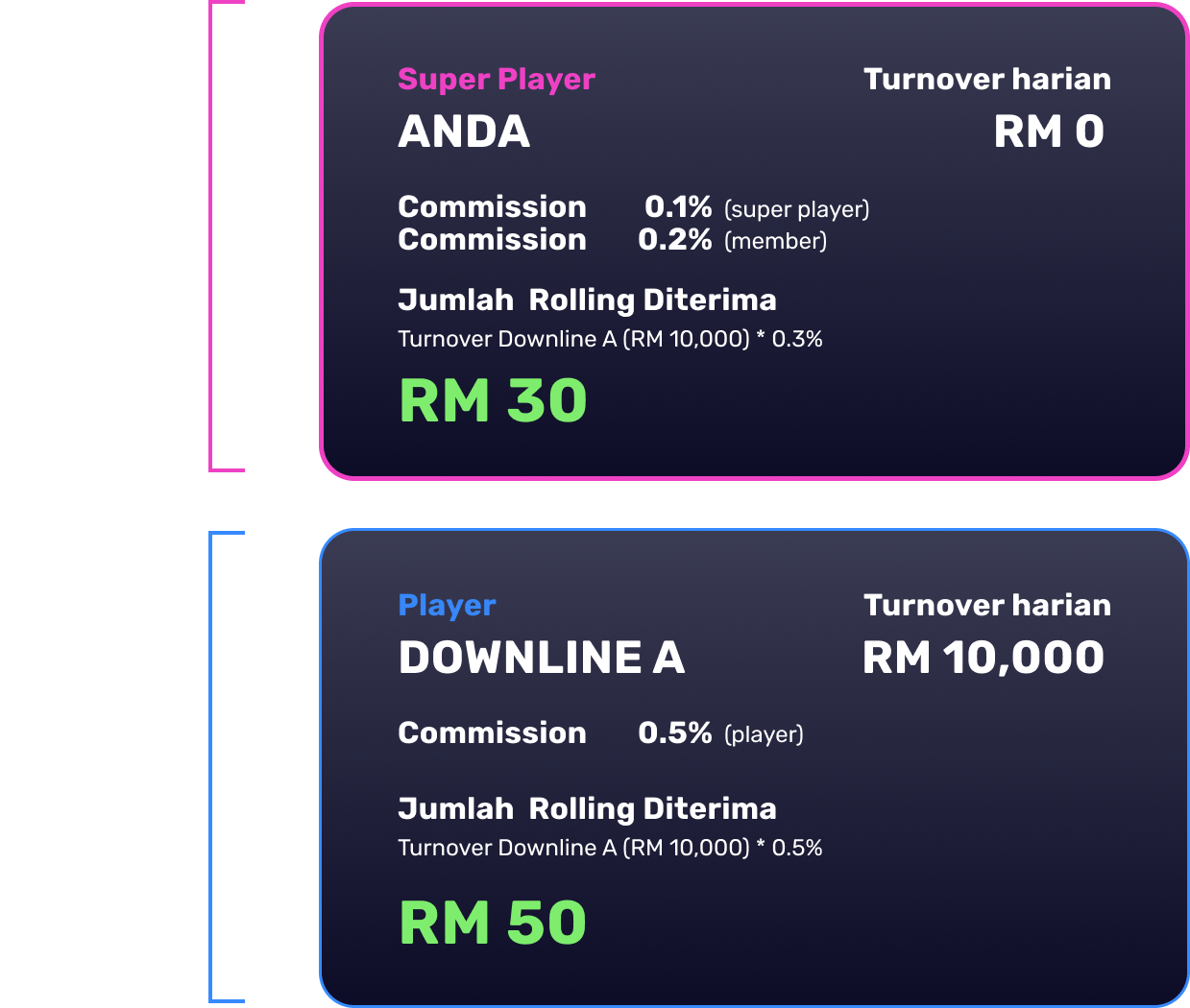 Anda hanya akan menerima peratusan rolling tambahan sebagai 'super player' daripada downline yang AKTIF sahaja. Downline yang tidak mempunyai sebarang turnover tidak akan dikira.